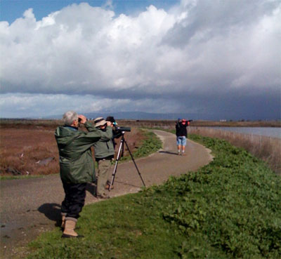 Perfect timing between rain storms for this half day walk at Hayward Shoreline Park. We had a wonderful almost rain free walk. The morning was sunny with great views around the bay. We could even see the tops of towers of the Golden Gate Bridge through the buildings of the city of San Francisco. Lots of ducks and shorebirds. Had good scope looks at a couple of Peregrine falcons having a nice breakfast snack on the ground. Only on our walk back to the cars did it start to rain (pour.)